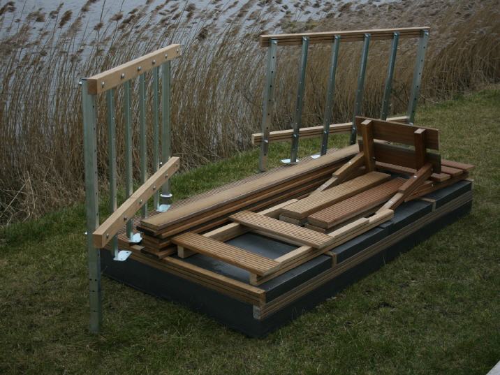• Dek van hardhout. Maar ook Europees zacht hout. Kunststof of composiet is in overleg ook mogelijk. Wij werken met uitsluitend FSC gecertificeerde leveranciers. Het hout kan optioneel van een nano-coating worden voorzien. Dit remt groene aanslag en zorgt ervoor dat het minder snel glad wordt.